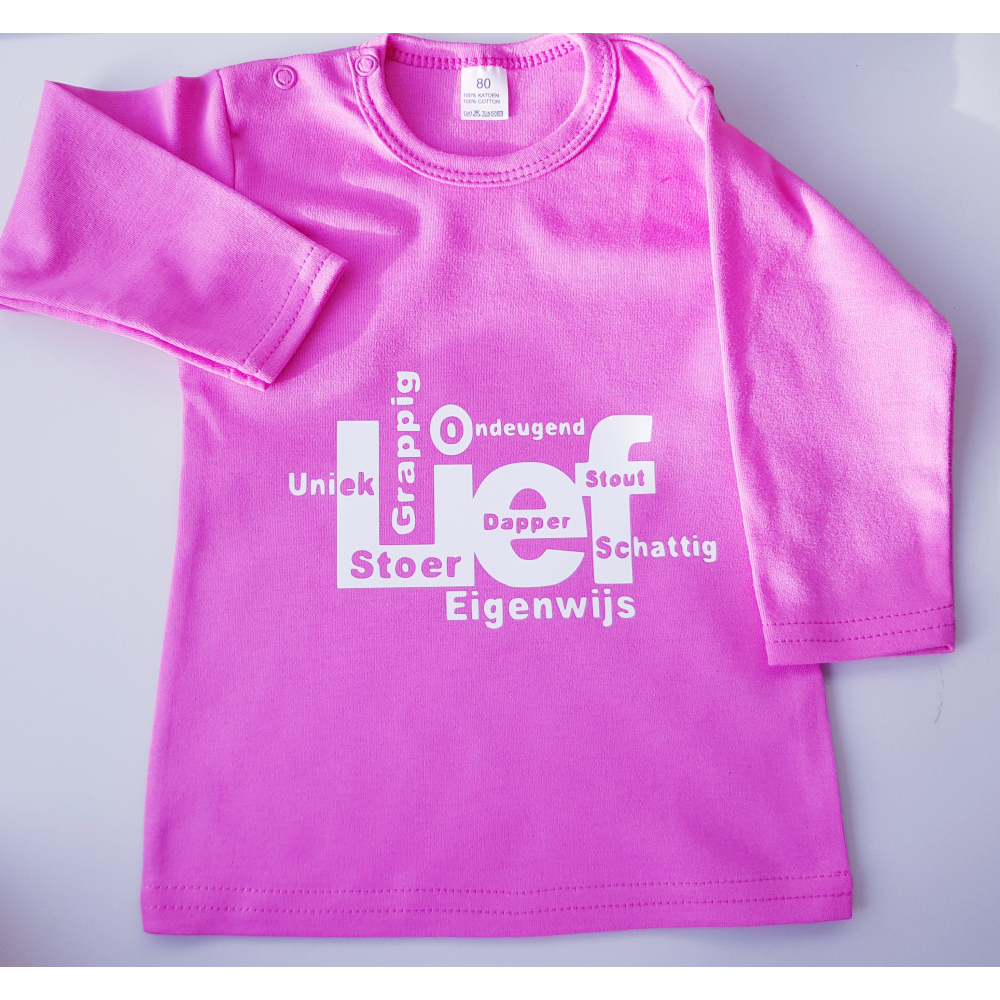 Unisex shirt met de tekst lief, stoer, ondeugend, grappig, uniek en andere karaktereigenschappen.
