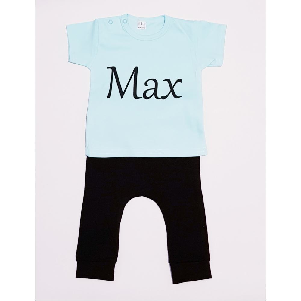 Zwart effen broekje met een gekleurd shirt naar keuze met de door jou gekozen naam in het zwart