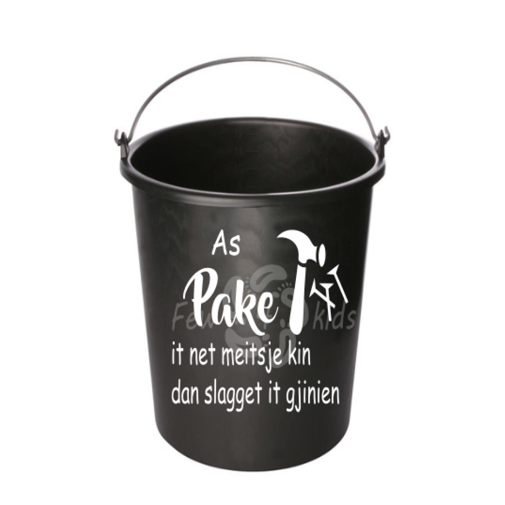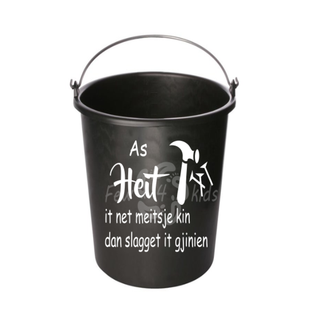 De emmer kun je bestellen met tekst in het Nederlands en in het Fries.