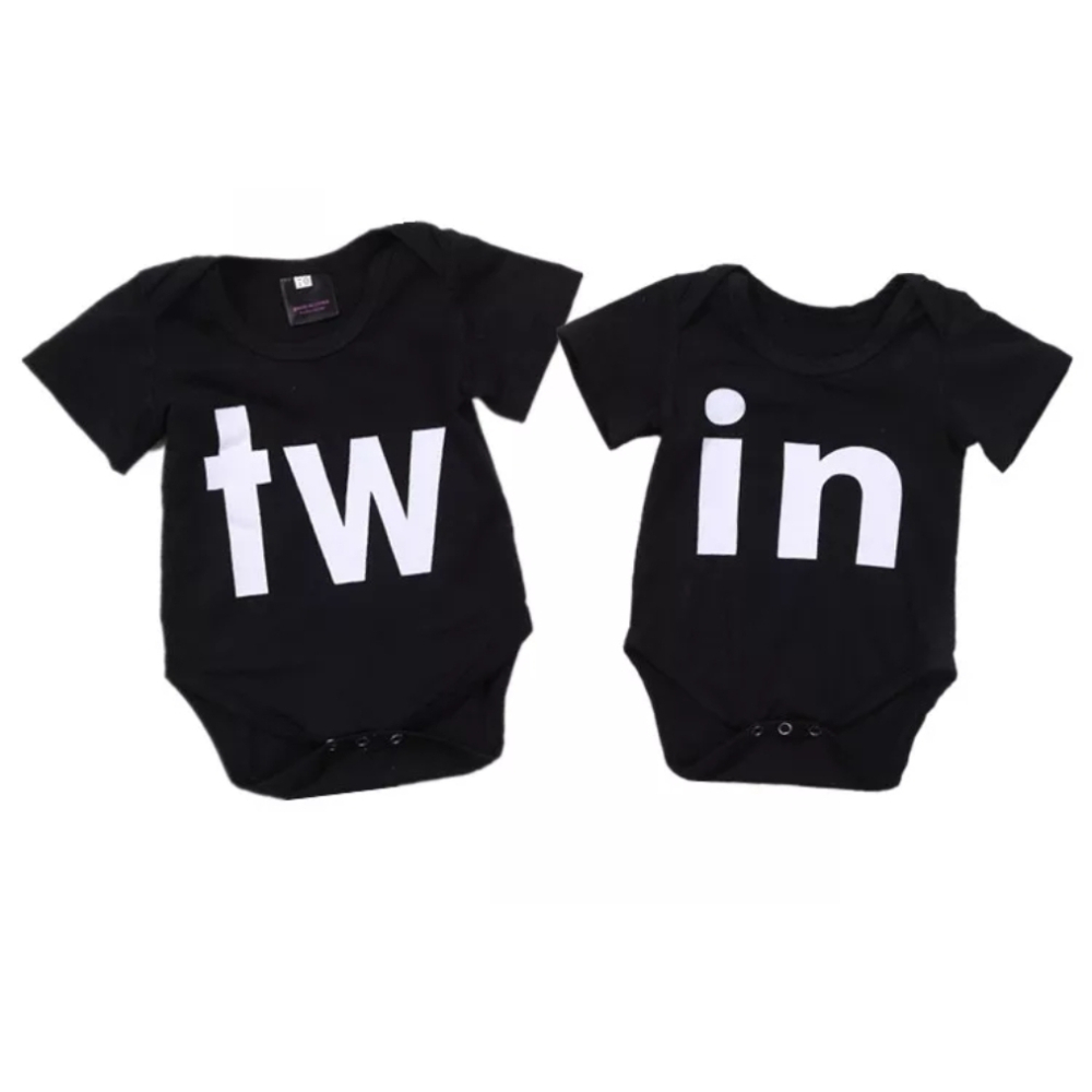 Een romperset bestaande uit 2 rompers voor tweelingkindertjes.
