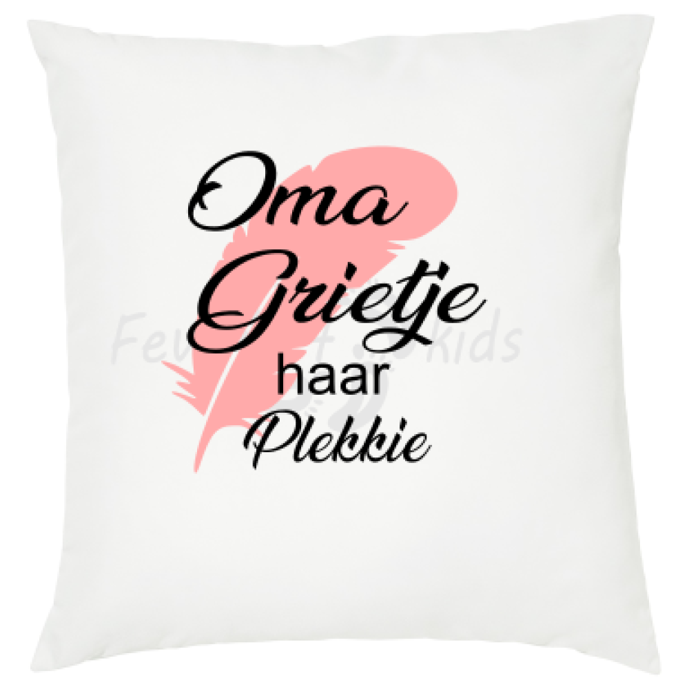 Sierkussen word geleverd in het wit zoals op de foto met opdruk Oma ... haar plekkie.