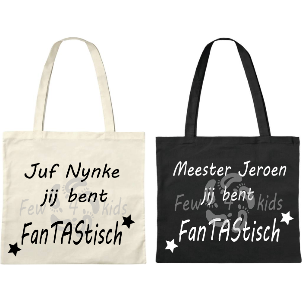 Er kan gekozen worden uit tekstkleur, kleur tas en of het voor juf of meester is met de naam van hem of haar.